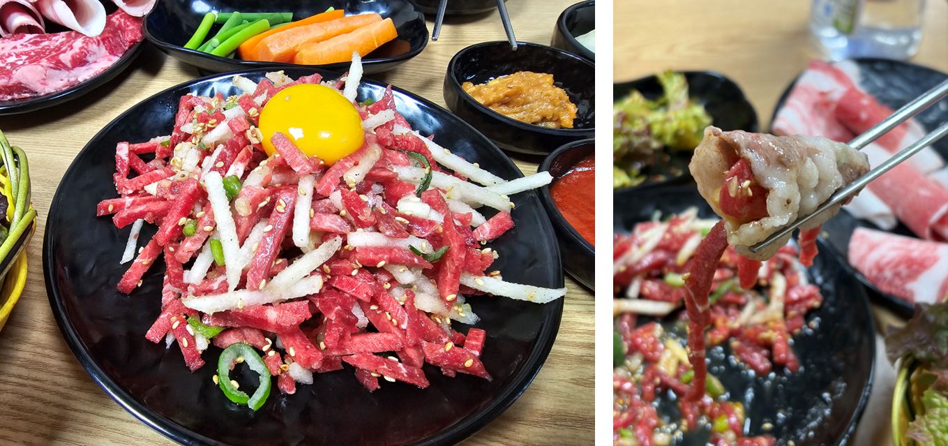 차돌박이의 고소함과 육회의 식감이 합쳐지면서 고기 + 고기 조합이 완성됩니다.